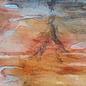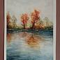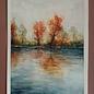 A watercolour painting that captures the beauty and colourfulness of autumn in a unique way. The painting shows a lake in the middle of an autumnal landscape, with trees in the background and a clear sky. The warm colours and smooth transitions give the painting a calming atmosphere. Painted in October 2022