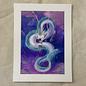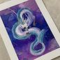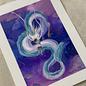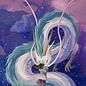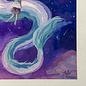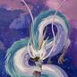 Dieses Gouachegemälde zeigt einen Drachen und ein Mädchen, die in einer Wolkenlandschaft fliegen. Die Szene ist in sanfte lila Töne getaucht, die eine ruhige und gleichzeitig mystische Atmosphäre erzeugen.